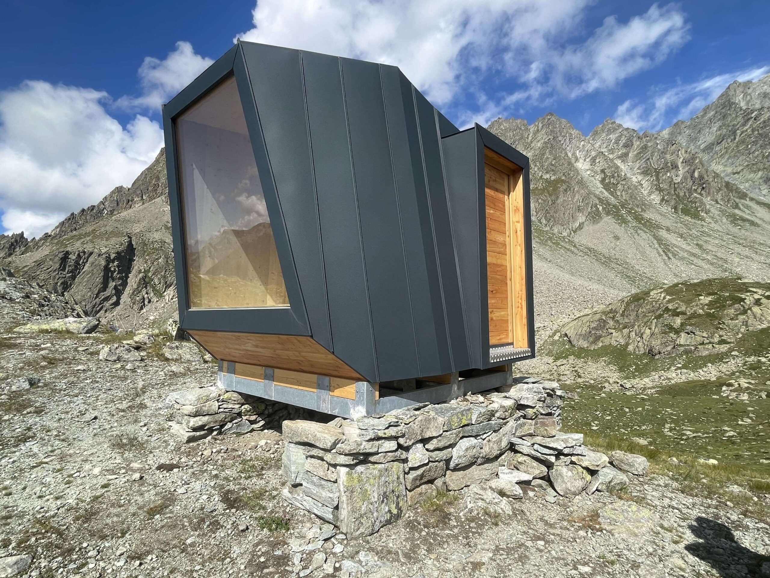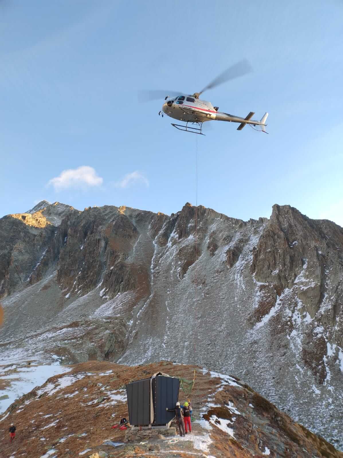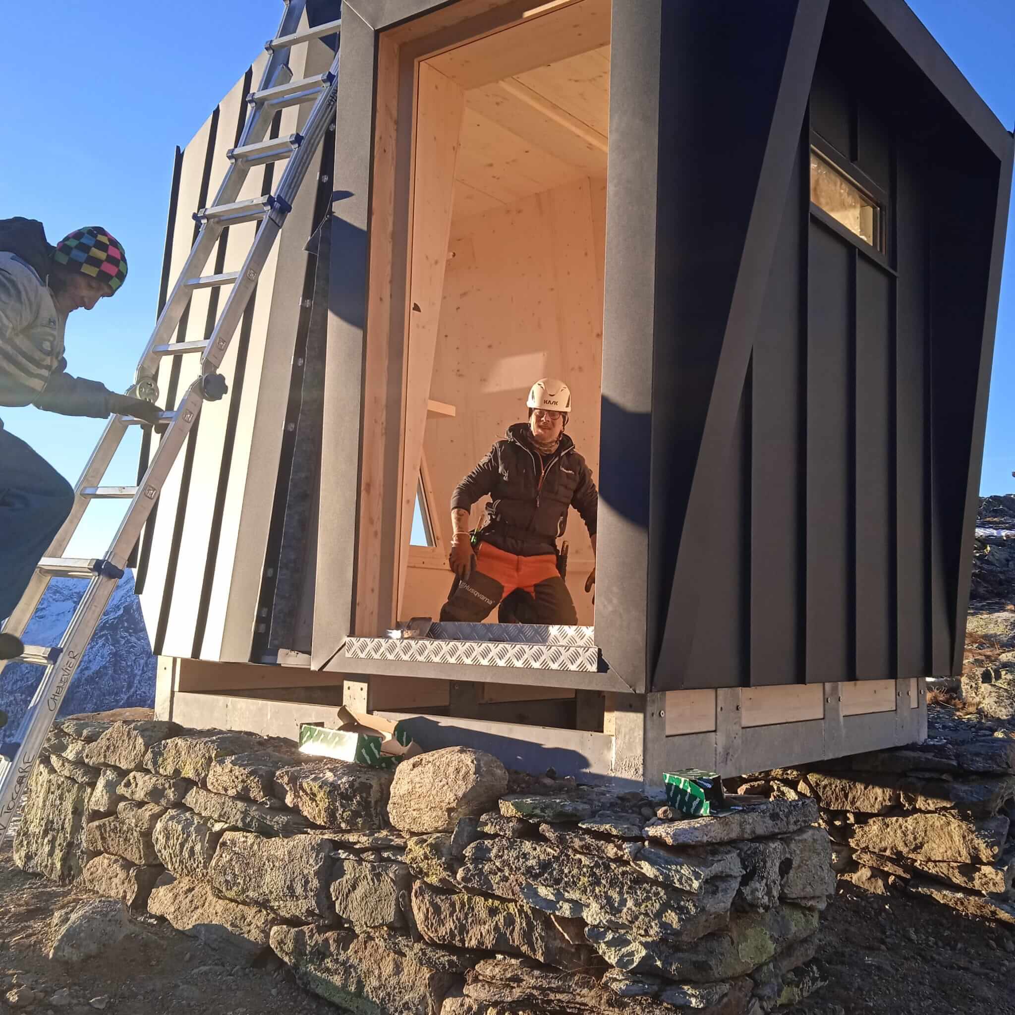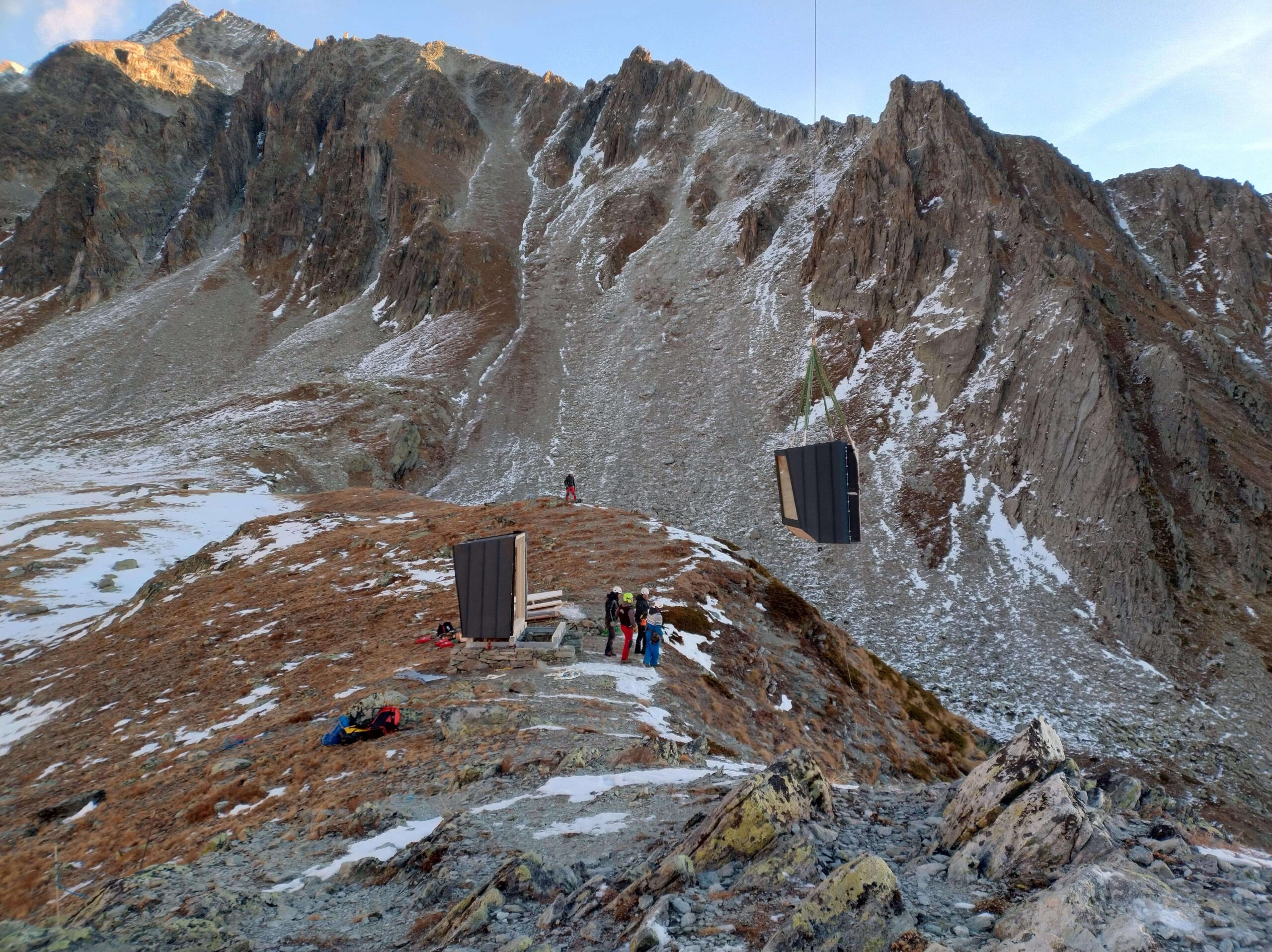 Il bivacco è stato elitrasportato in quota in due elementi e successivamente assemblato in sito, riducendo al minimo l’impatto delle lavorazioni sull’ambiente naturale circostante.